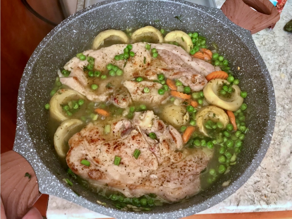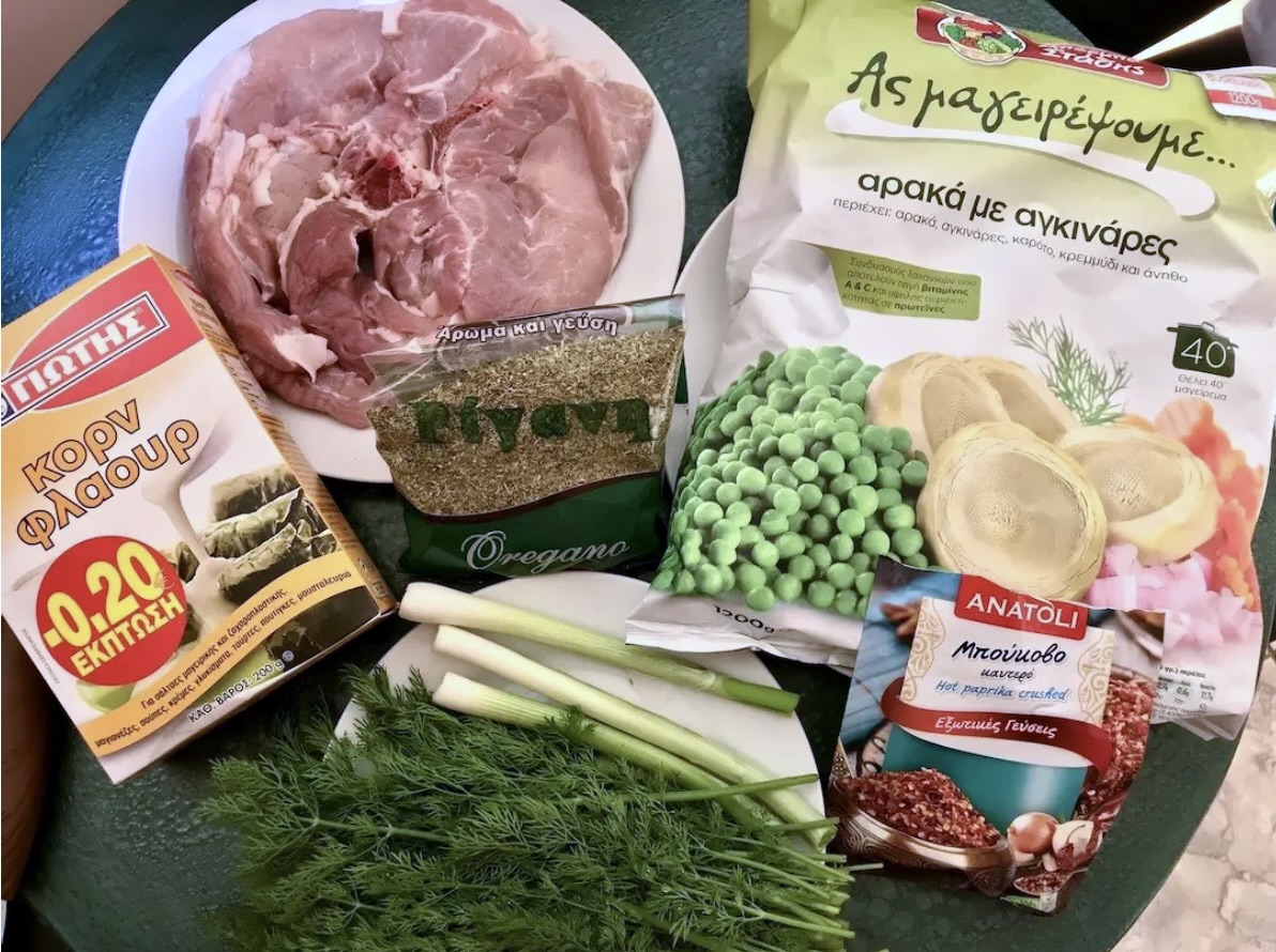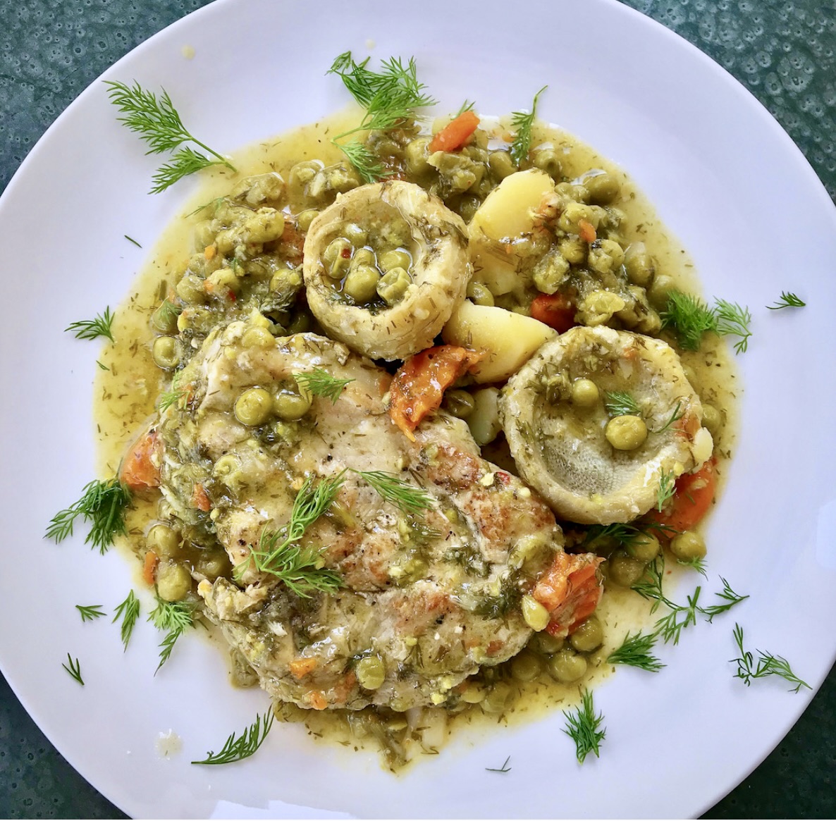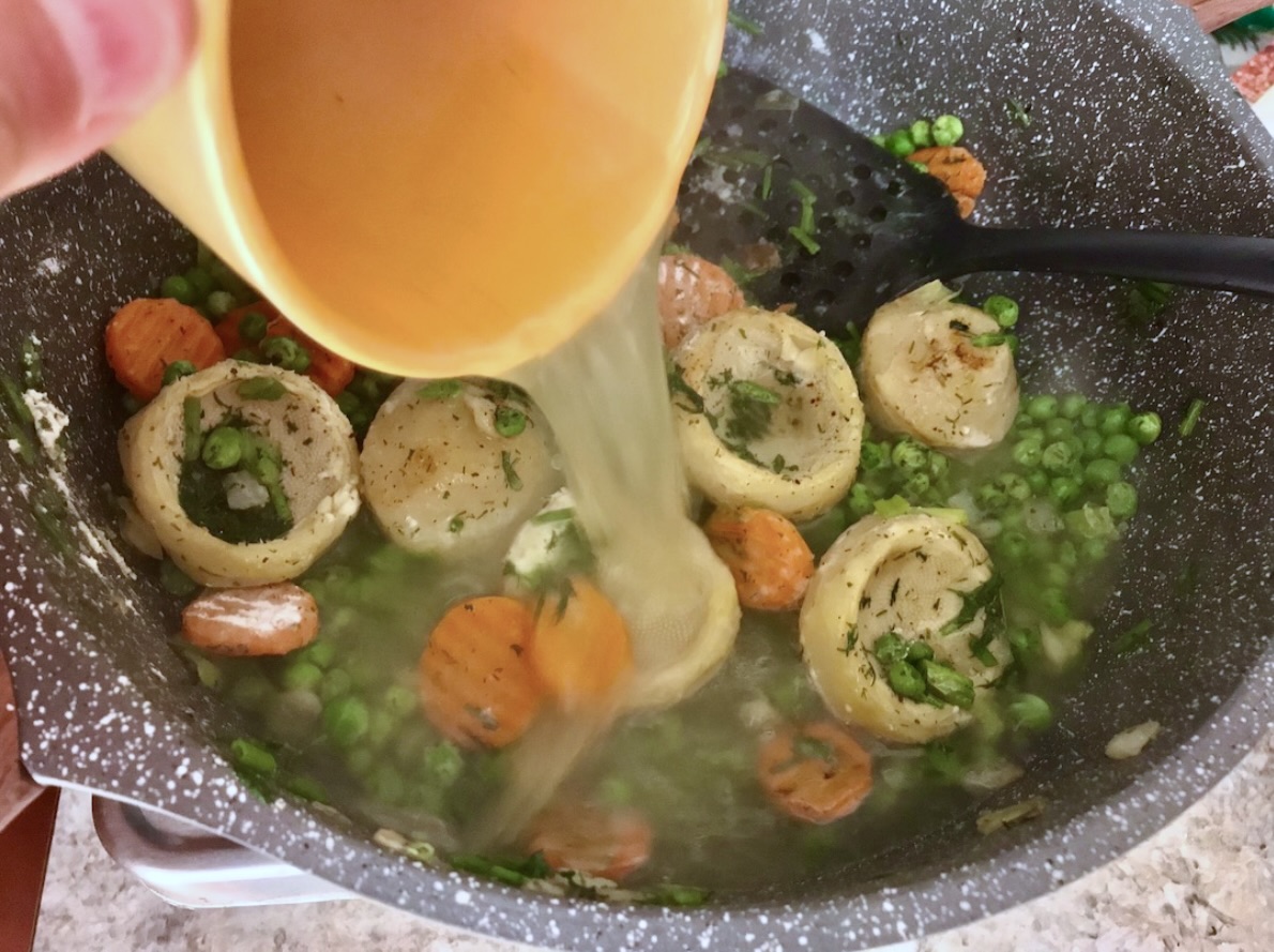 Warzywa: kilka serc karczochów (mogą być mrożone), 2 garści zielonego groszku, mała marchewka (w plasterkach), 1-2 ziemniaki sałatkowe (pokrojone w dużą kostkę).