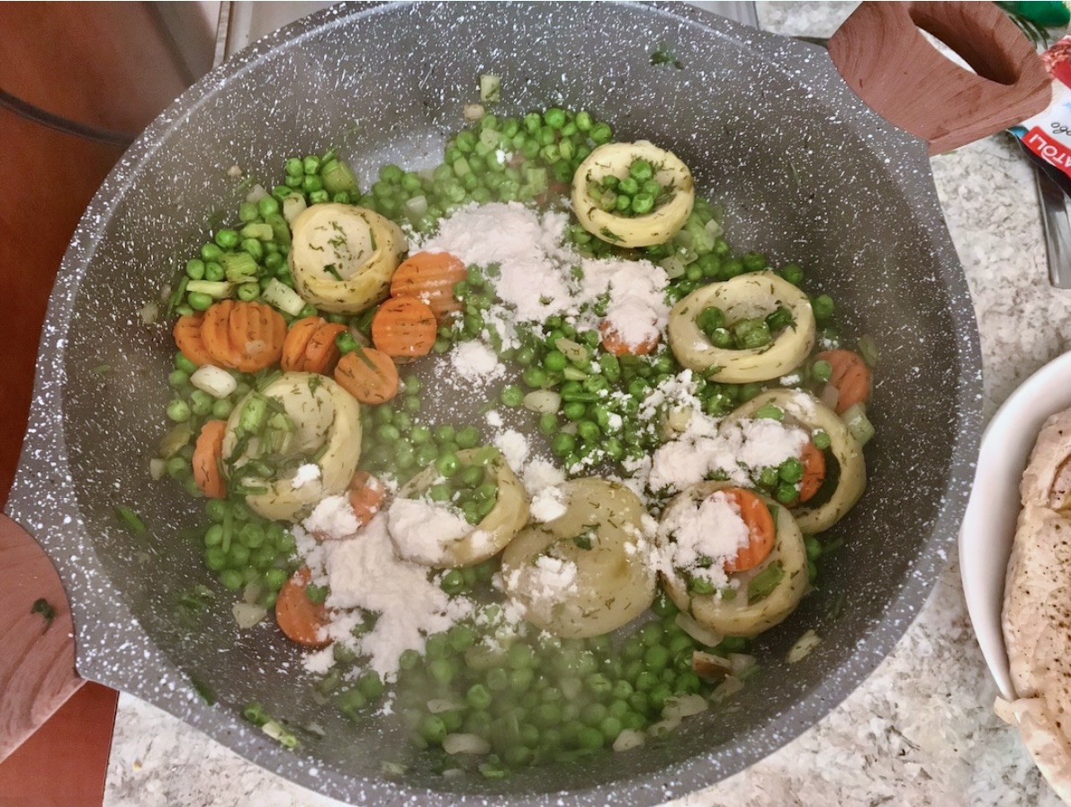 Przygotowanie bazy warzywnej: Na tę samą patelnię wrzuć karczochy, groszek i marchewkę oraz łodyżki koperku (dla smaku). Smaż krótko, po czym wsyp łyżeczkę mąki i smaż jeszcze minutę.