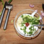 Dodaj posiekaną dymkę, łyżeczkę ostrego sosu, zmiażdżony ząbek czosnku i nieco soli.