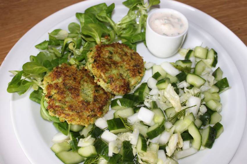 Rozłóż na talerzu nieco roszponki i ułóż na niej kotlety. Kotlety z brokuła podawaj z zimnym dipem jogurtowym (przygotowanym w kroku 3.) oraz np. z surówką z ogórka (zobacz przepis na surówkę gruzińską).