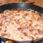 Przygotowanie sosu: Na patelnię z kurkami wlej 150 ml śmietany kremówki, posól i popieprz. Duś całość przez kilka minut, aż sos się zredukuje i zgęstnieje.