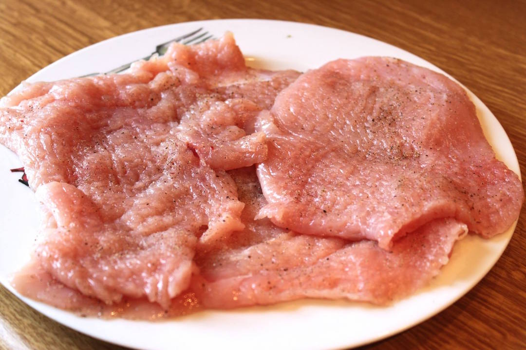 Przygotowanie mięsa: Kotlety z indyka delikatnie rozbij do równej grubości, a następnie posól i popieprz.
