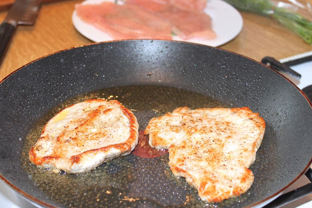 Duszenie kotletów: Przełóż przesmażone kotlety do rondelka, wlej szklankę gorącej wody, przykryj i duś na małym ogniu przez 10 minut.