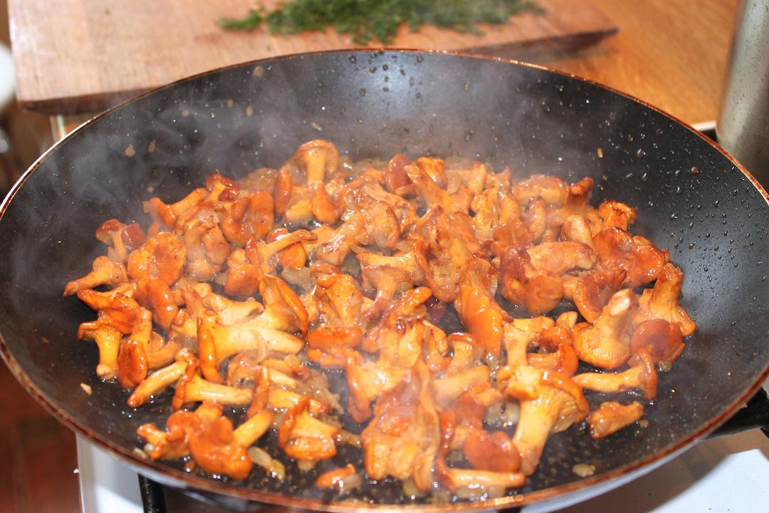 Przygotowanie kurek i cebuli: Na patelni, na której smażyło się mięso, dodaj nieco masła klarowanego. Wrzuć pokrojoną w drobną kostkę cebulę, a następnie smaż do zeszklenia. Następnie dodaj oczyszczone kurki i smaż na średnim ogniu przez 5 minut, aż zmiękną.