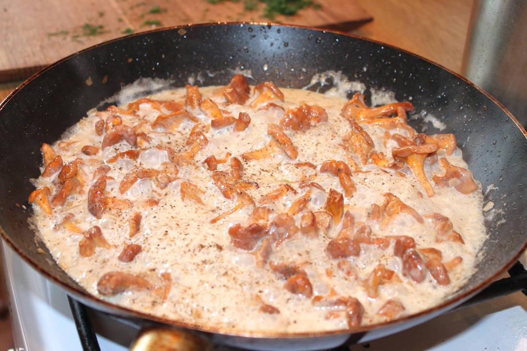 Przygotowanie sosu: Na patelnię z kurkami wlej 150 ml śmietany kremówki, posól i popieprz. Duś całość przez kilka minut, aż sos się zredukuje i zgęstnieje.