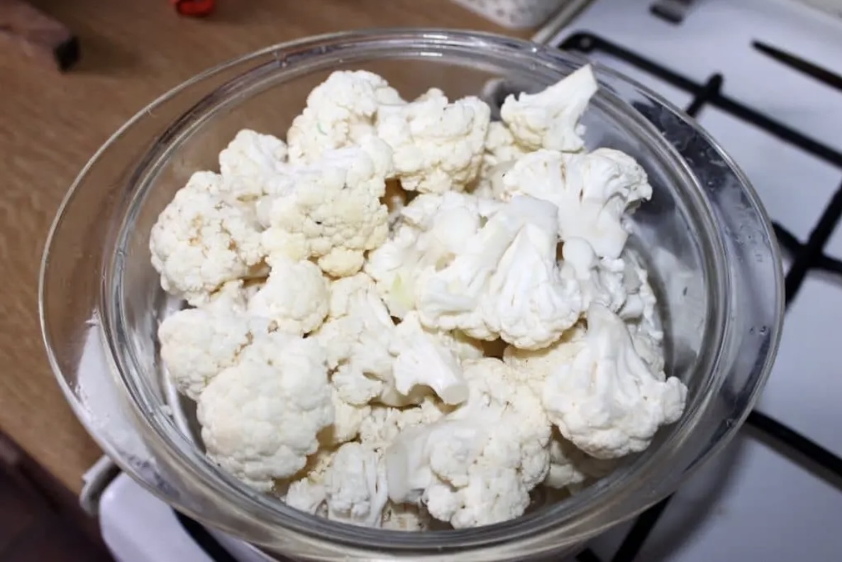 Gotowanie kalafiora: Kalafiora podziel na różyczki, umyj i ugotuj najlepiej na parze (metoda ta pozwala uniknąć nadmiaru wody), aż będzie „al dente”.
