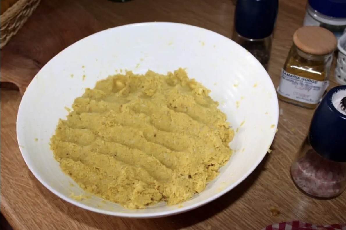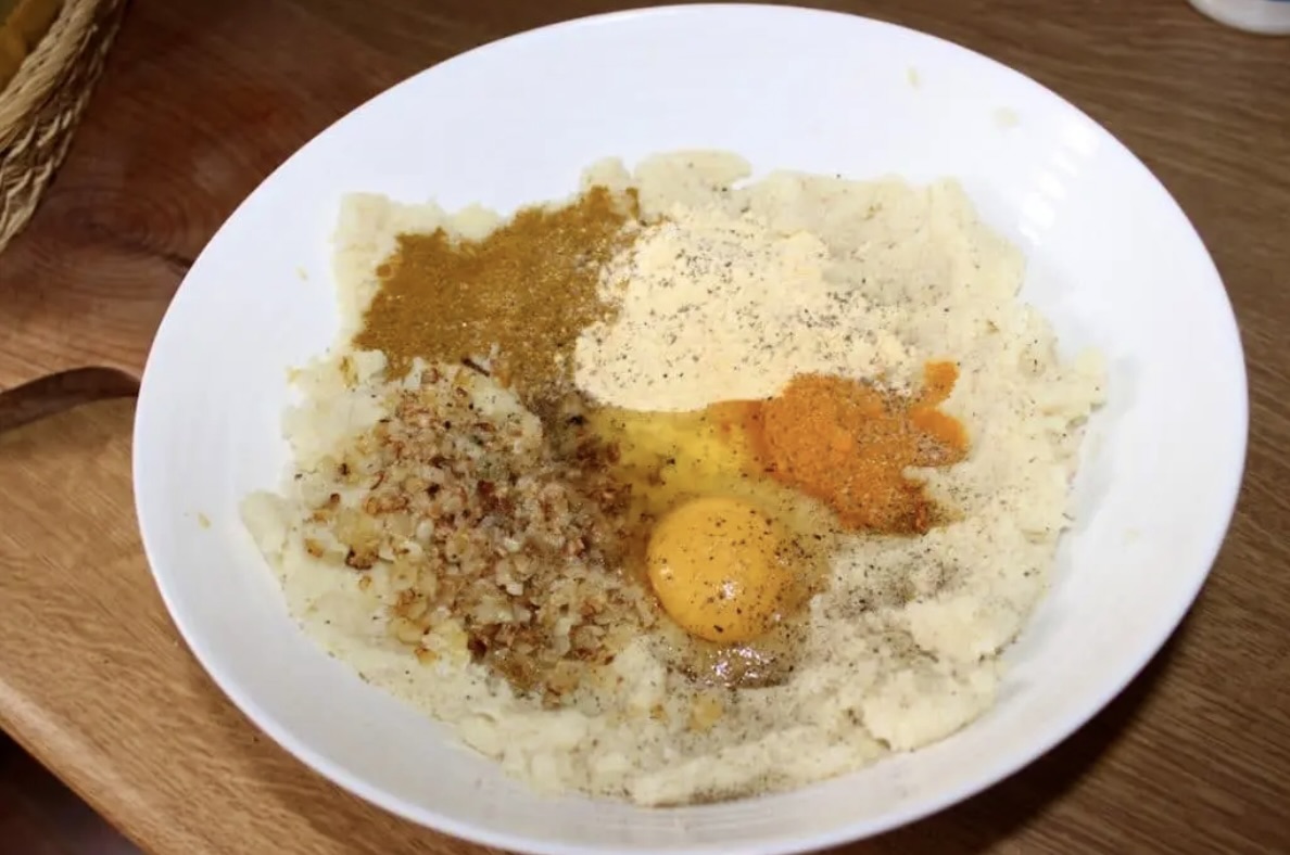 Przygotowanie masy: W dużej misce wymieszaj masę kalafiorową, podsmażoną cebulę, mąkę, jajko oraz przyprawy (curry, kurkumę, sól i pieprz).
