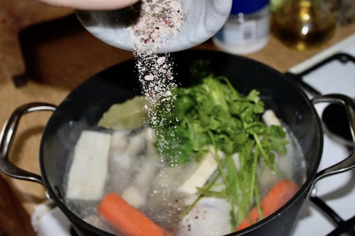 Dodaj jarzynę do rosołu, liść laurowy, zmiażdżoną w moździerzu mieszankę ziela angielskiego, soli i pieprzu ziarnistego.