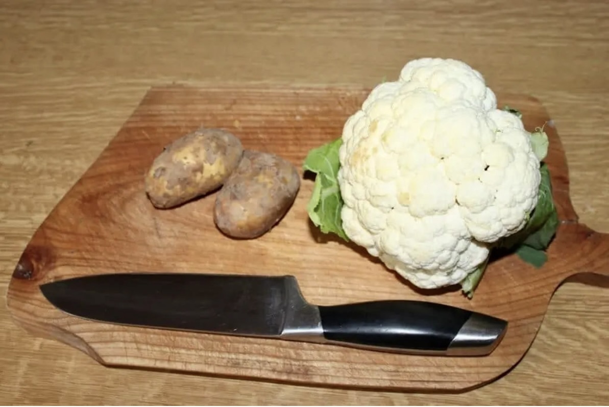Kalafiora umyj, pozbaw głąba i podziel na różyczki. Ziemniaki obierz i pokrój w grubą kostkę.