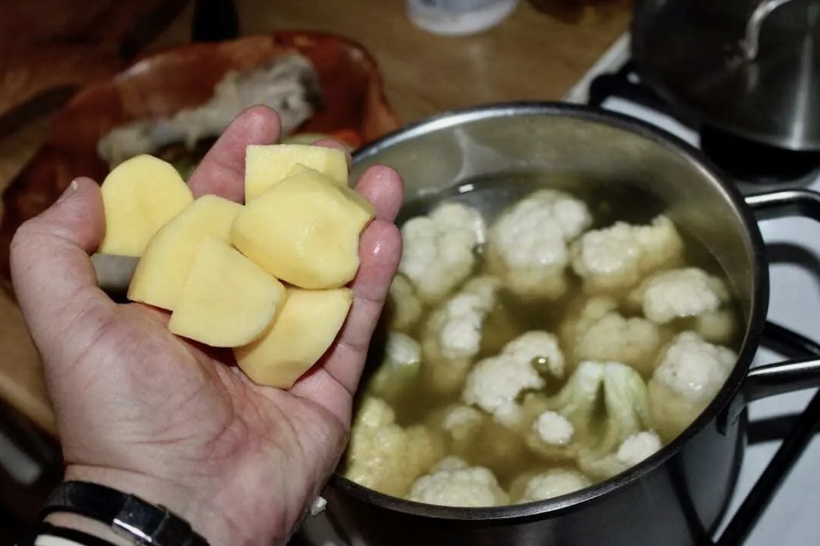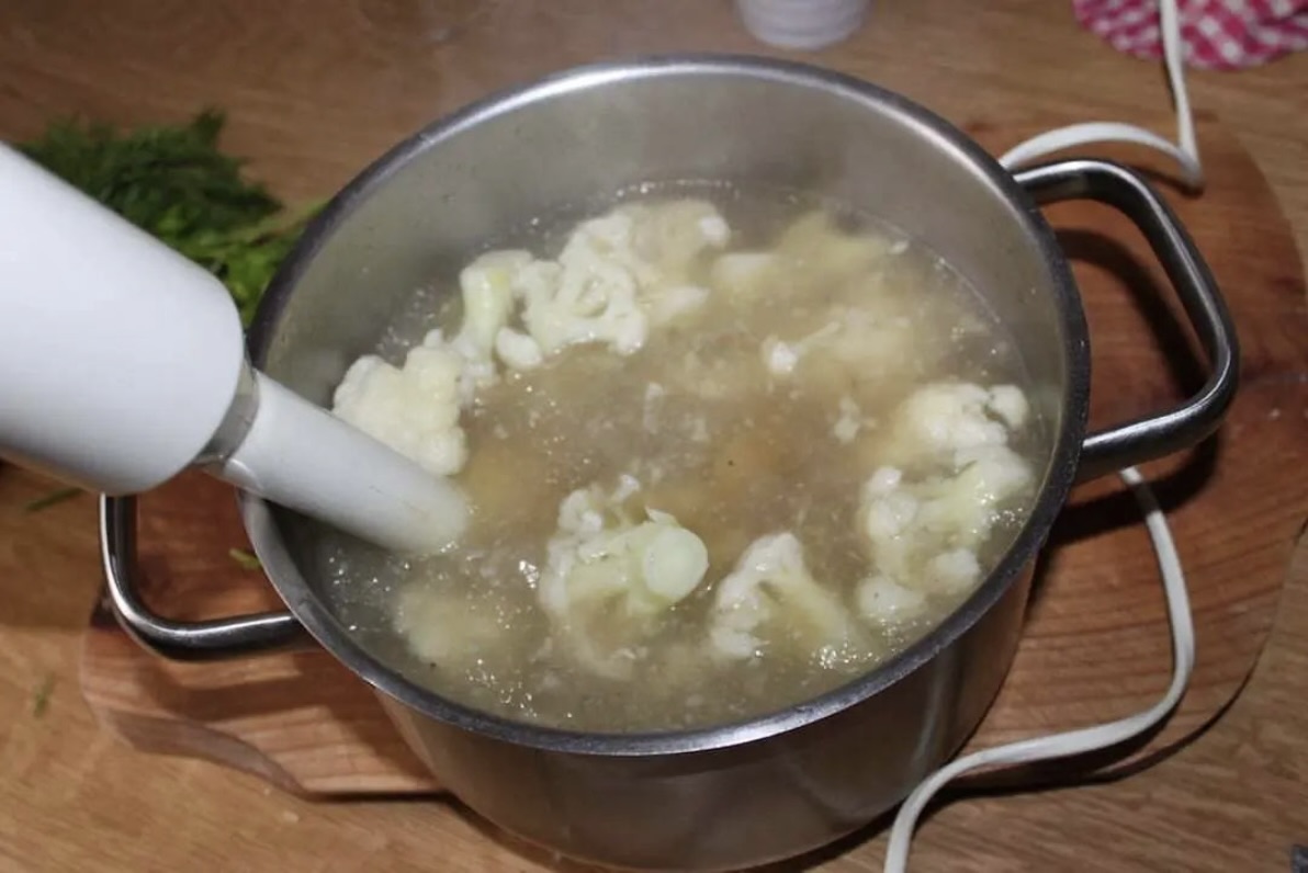 Dodaj kalafior i ziemniaki do ugotowanego bulionu. Gotuj wszystko około 15 minut.