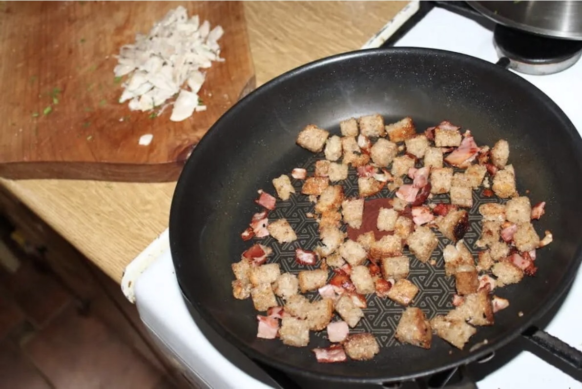 Następnie dorzuć chleb. Smaż, aż chleb nabierze smaku szynki.