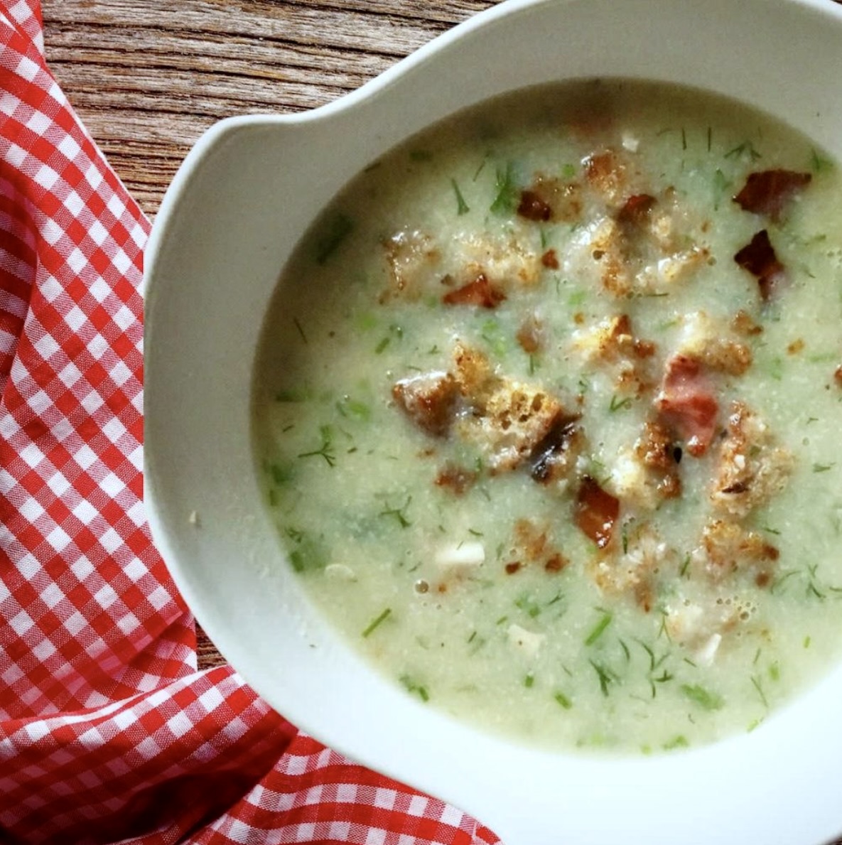 Krem z kalafiora, czyli zupa na bazie bulionu drobiowego z kalafiorem i ziemniakami, po ugotowaniu miksowana i podana z grzankami z szynką. Ta zupa krem z kalafiora to moja kolejna mutacja klasycznej kalafiorowej. Jasne, że trudno wymyślić całkiem nową kalafiorową, co zresztą nie jest moim celem. Zupę kalafiorową po prostu uwielbiam, a kolejne jej wersje powstają właściwie na poczekaniu, w zależności od tego, co akurat mam w lodówce. Oczywiście zawsze to kalafior jest głównym składnikiem. Tym razem powstała zupa krem z kalafiora z szynką i grzankami. Jest przepyszna, bo z dominującą nutą aromatu wędzonej w prawdziwym dymie szynki.