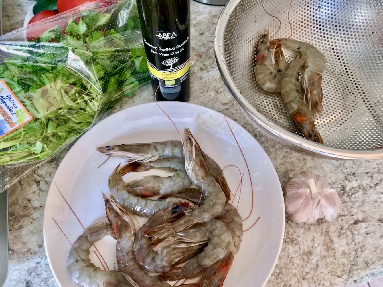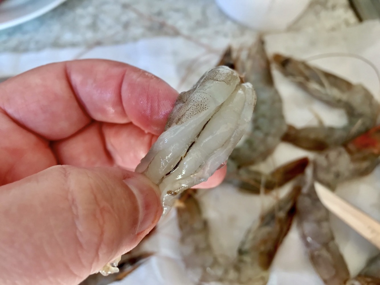 Oczyść krewetki: Obierz krewetki z pancerzyków (zalecam pozostawienie głowy i ogonka).