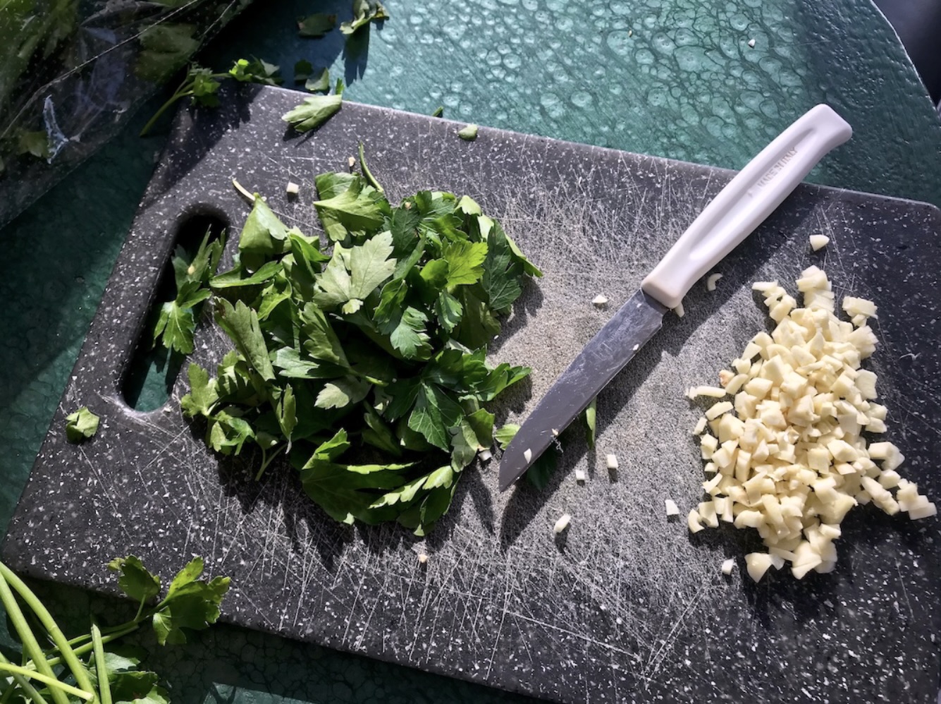 Gdy krewetki są gotowe, wyłącz ogień i dodaj posiekaną natkę pietruszki.