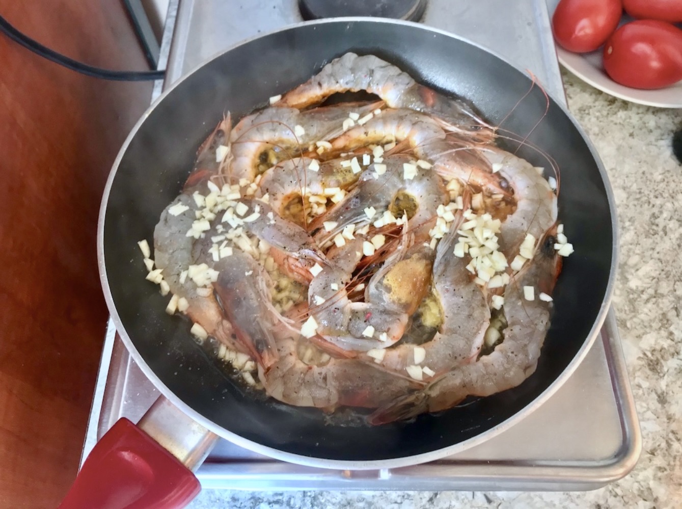 Gdy krewetki zaczną zmieniać kolor na różowy od spodu, dodaj posiekany czosnek na patelnię.
