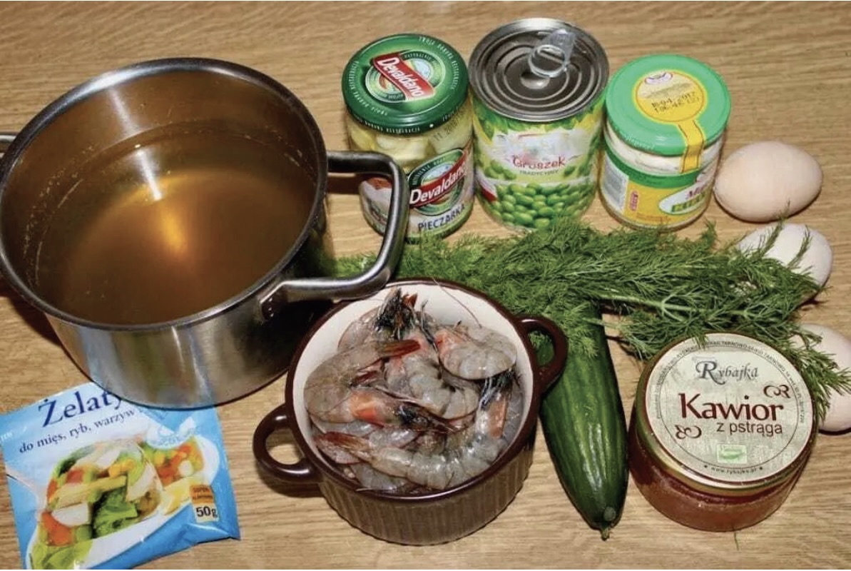 Pozostałe: 3 ugotowane na twardo jajka, kawior (z jesiotra, łososia, pstrąga lub tańszy), majonez, sól, pieprz, odrobina oliwy (do smażenia krewetek)