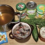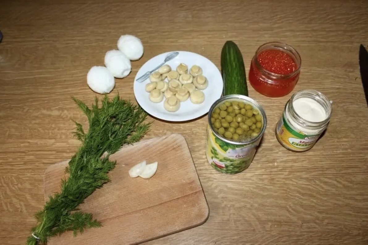 Warzywa i dodatki: Groszek konserwowy, pieczarki marynowane, świeży ogórek, pęczek koperku, ząbek czosnku