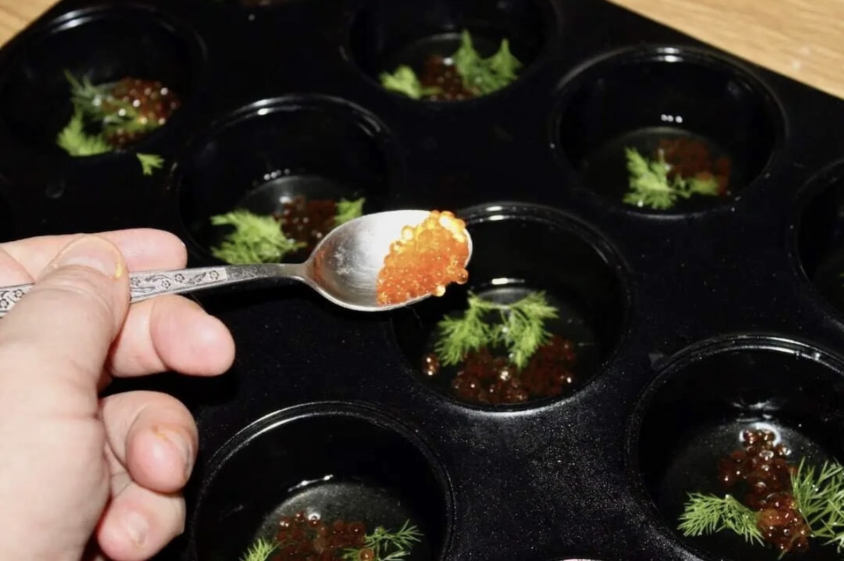 Ułóż gałązkę koperku i dodaj po pół łyżeczki kawioru.