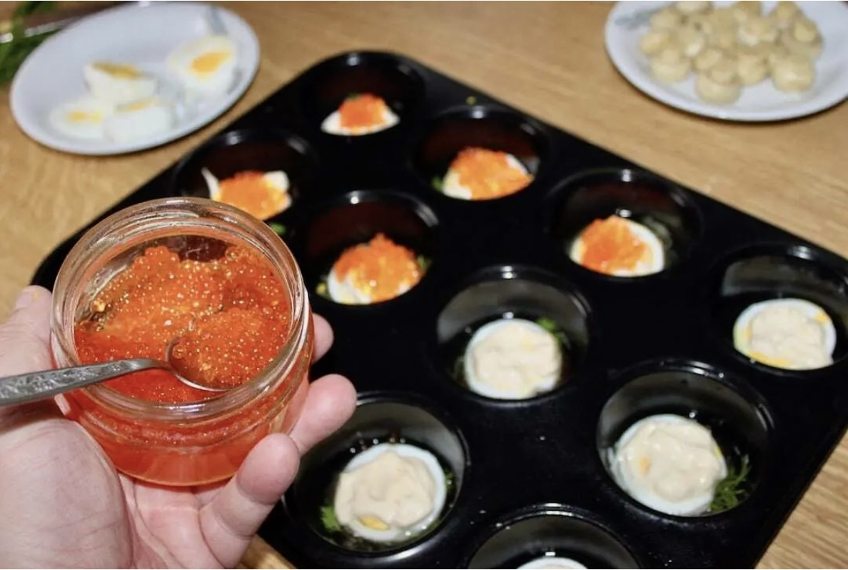 Na majonezie rozłóż 1 łyżeczkę kawioru.