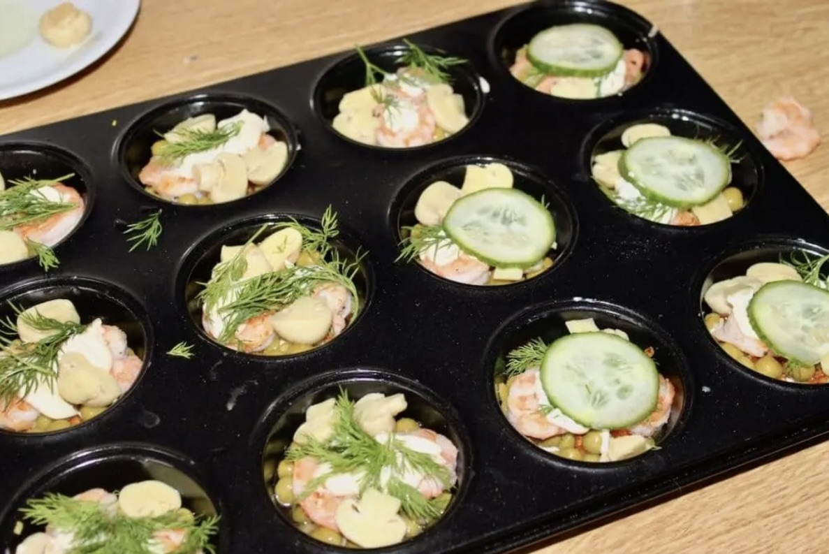 Przepis jest przeznaczony na znakomitą przystawkę, a kluczowe zasady to układanie składników w formie w kolejności odwrotnej do finalnego wyglądu (miękkie na spodzie, chrupiące na wierzchu) oraz unikanie przegotowania krewetek.