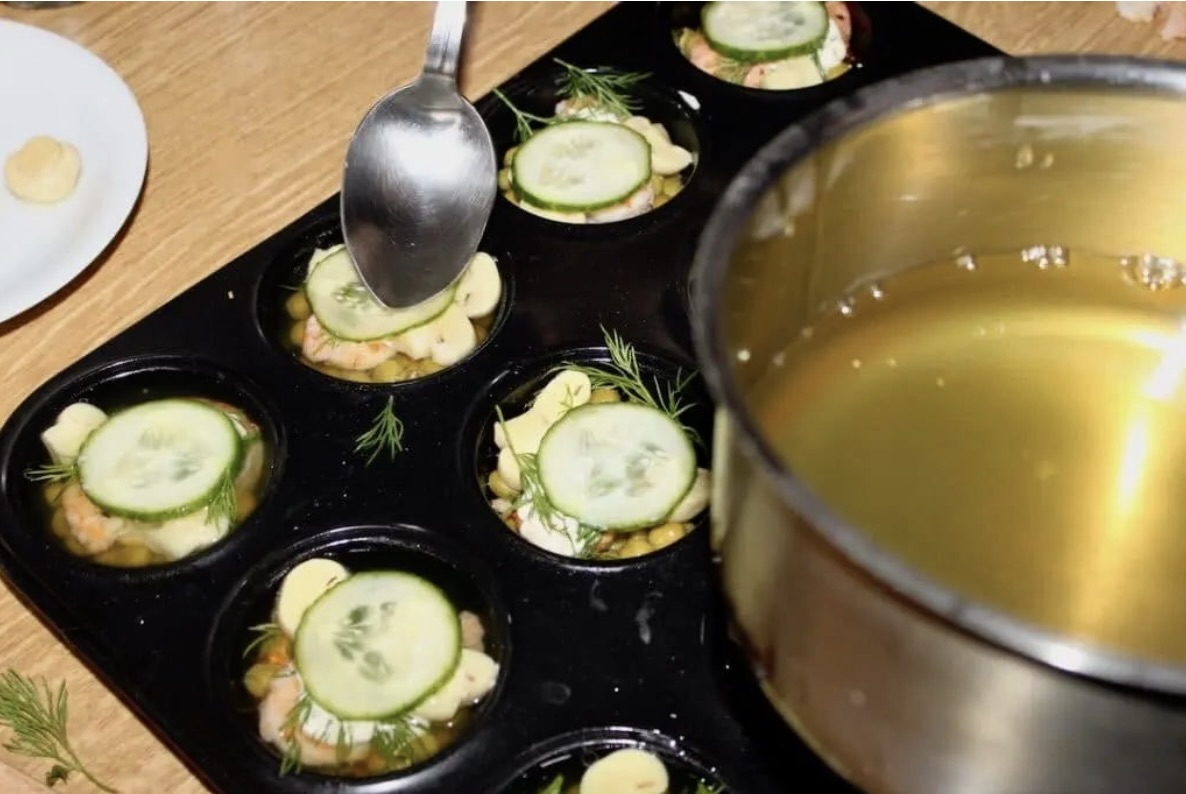 Na dno każdej formy wlej 1 łyżkę przestudzonego bulionu z żelatyną.