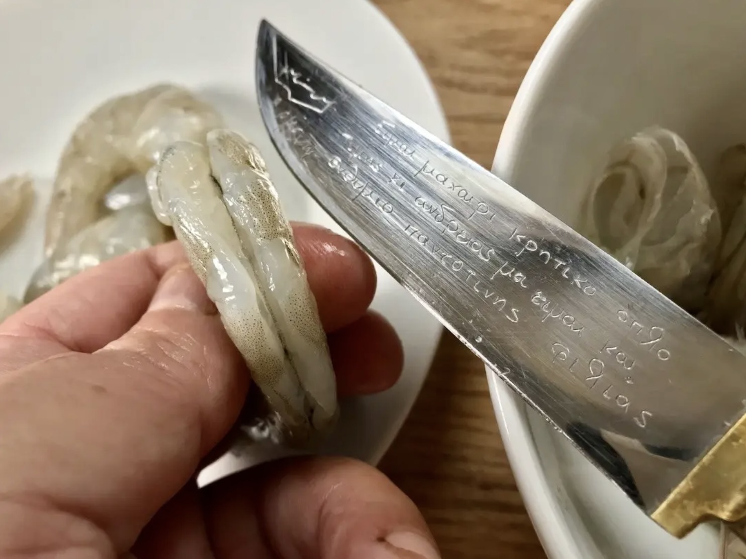 Ostrym nożykiem natnij grzbiet każdej krewetki wzdłuż i usuń przewód pokarmowy.