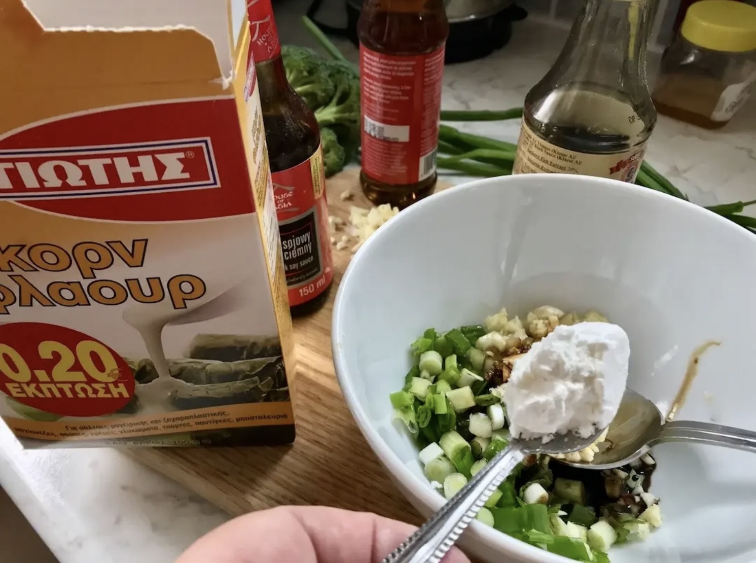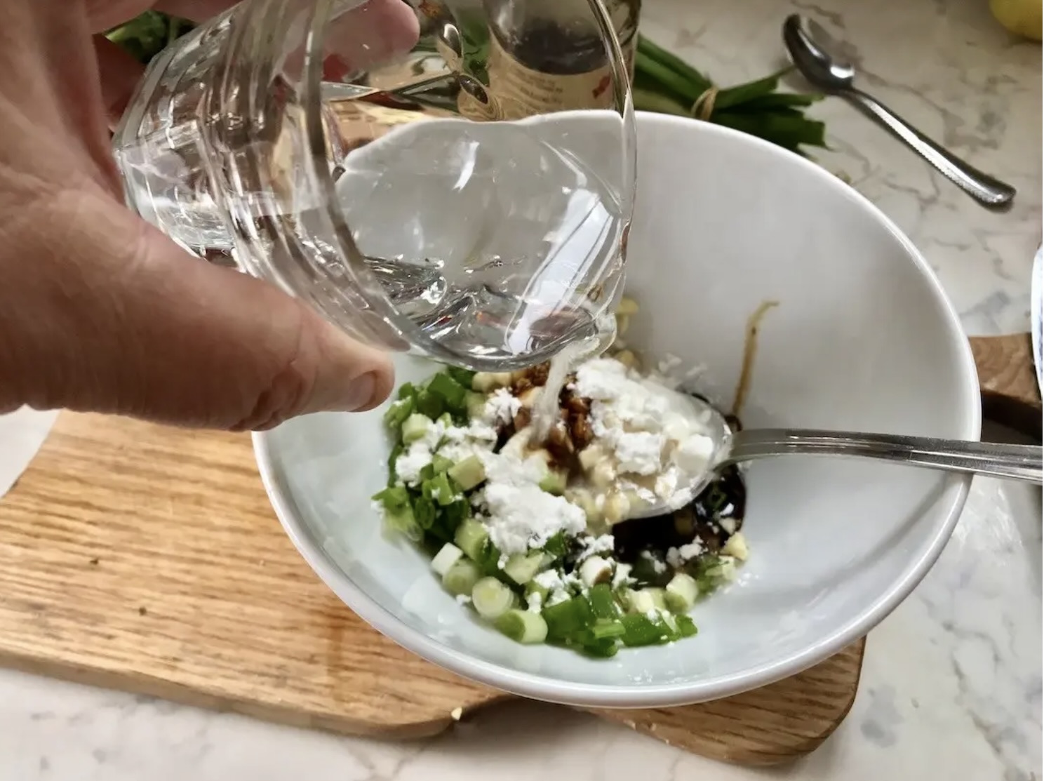 Do miski wrzuć posiekaną dymkę oraz większość posiekanego czosnku.