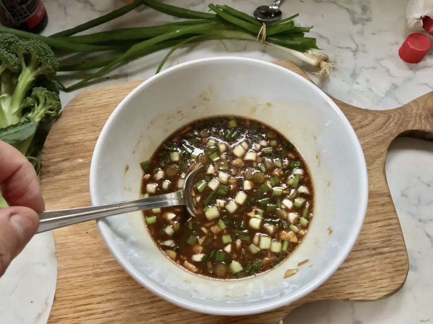 Wlej łyżkę sosu sojowego, łyżkę sosu rybnego oraz małą łyżeczkę oleju sezamowego z prażonego sezamu.