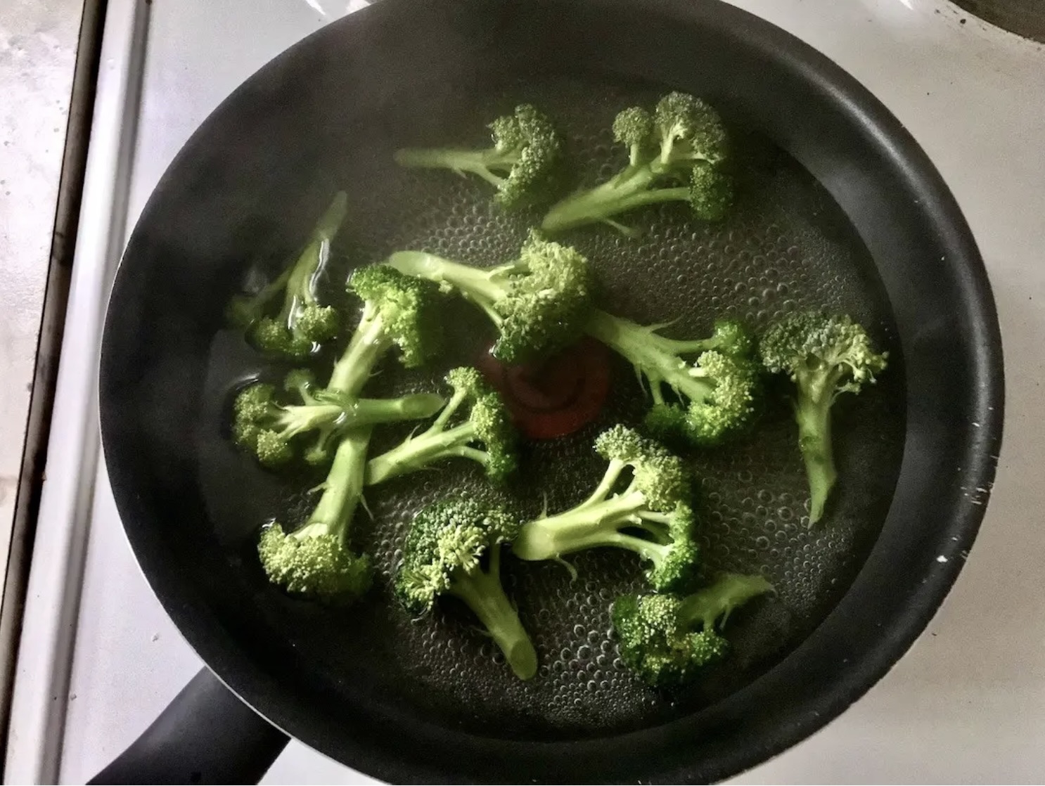 Wlej na patelnię nieco gorącej wody, wrzuć różyczki brokuła, przykryj patelnię pokrywką, a następnie gotuj warzywo przez 2 minuty.