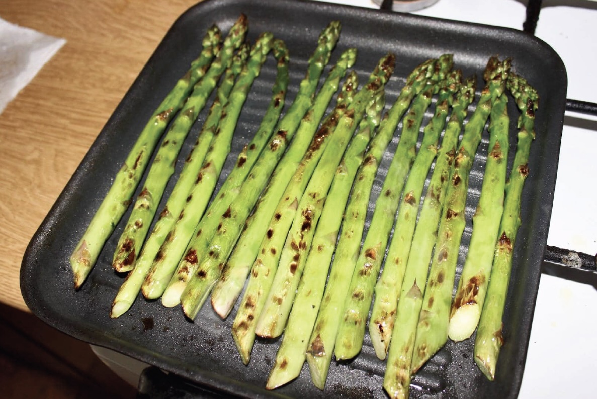Skrop oliwą i smaż na patelni grillowej, aż będą „al dente”.