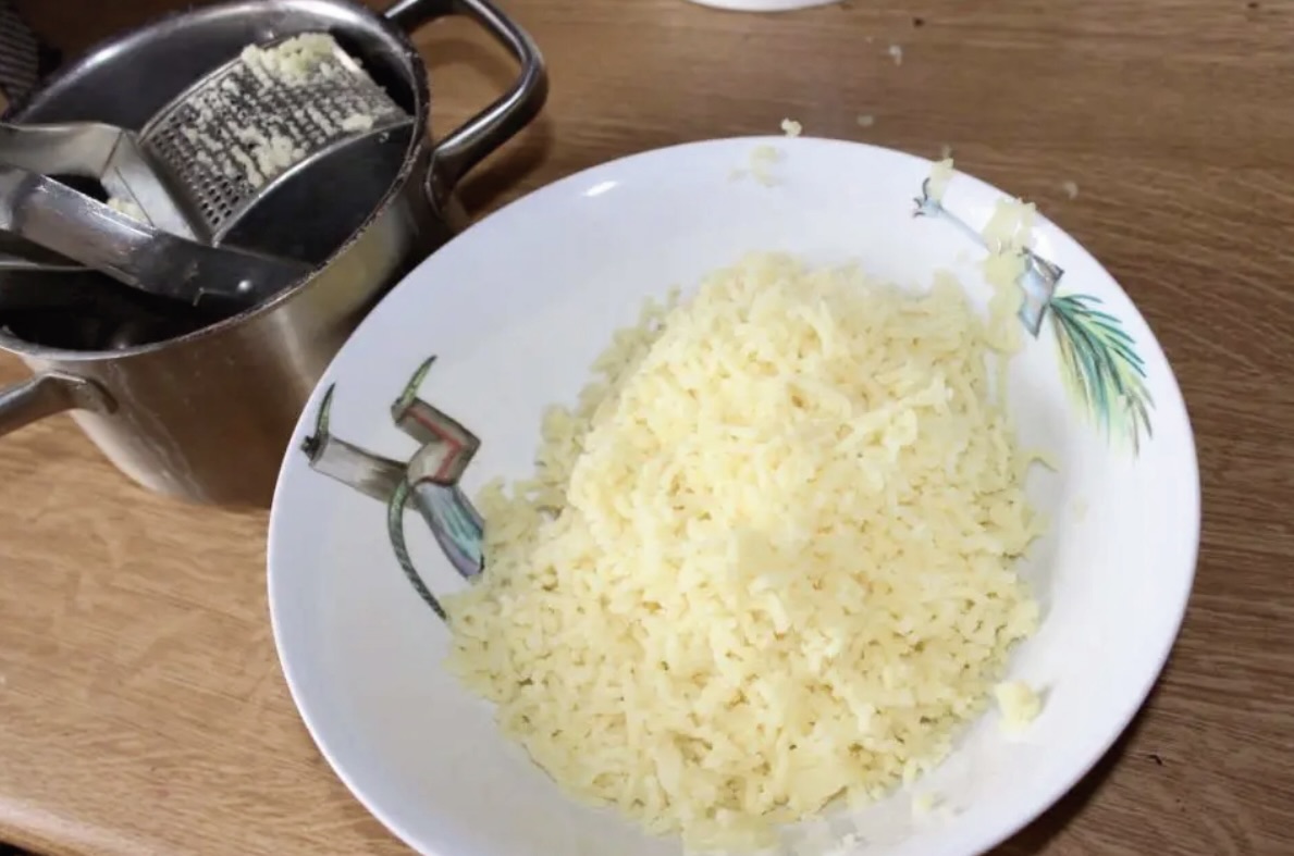 Ugotowane ziemniaki odcedź i przeciśnij przez praskę, aby były puszyste.