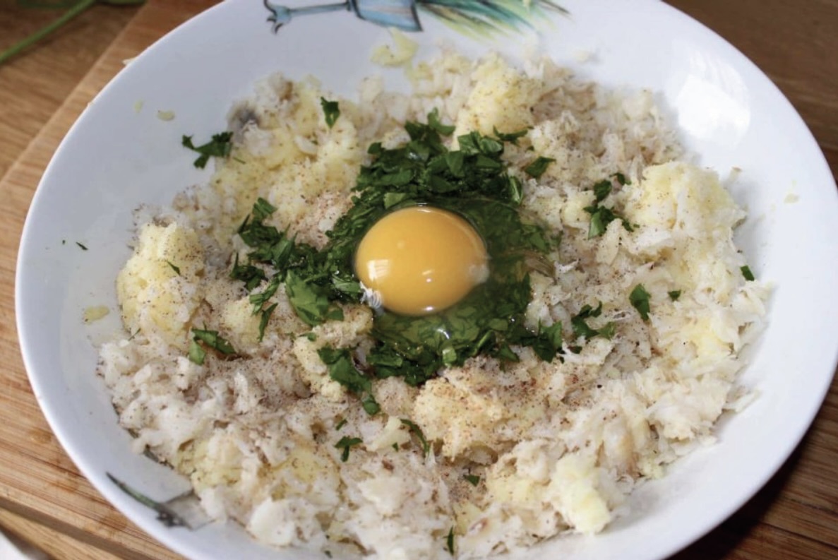 Do przeciśniętych ziemniaków dodaj posiekanego dorsza.