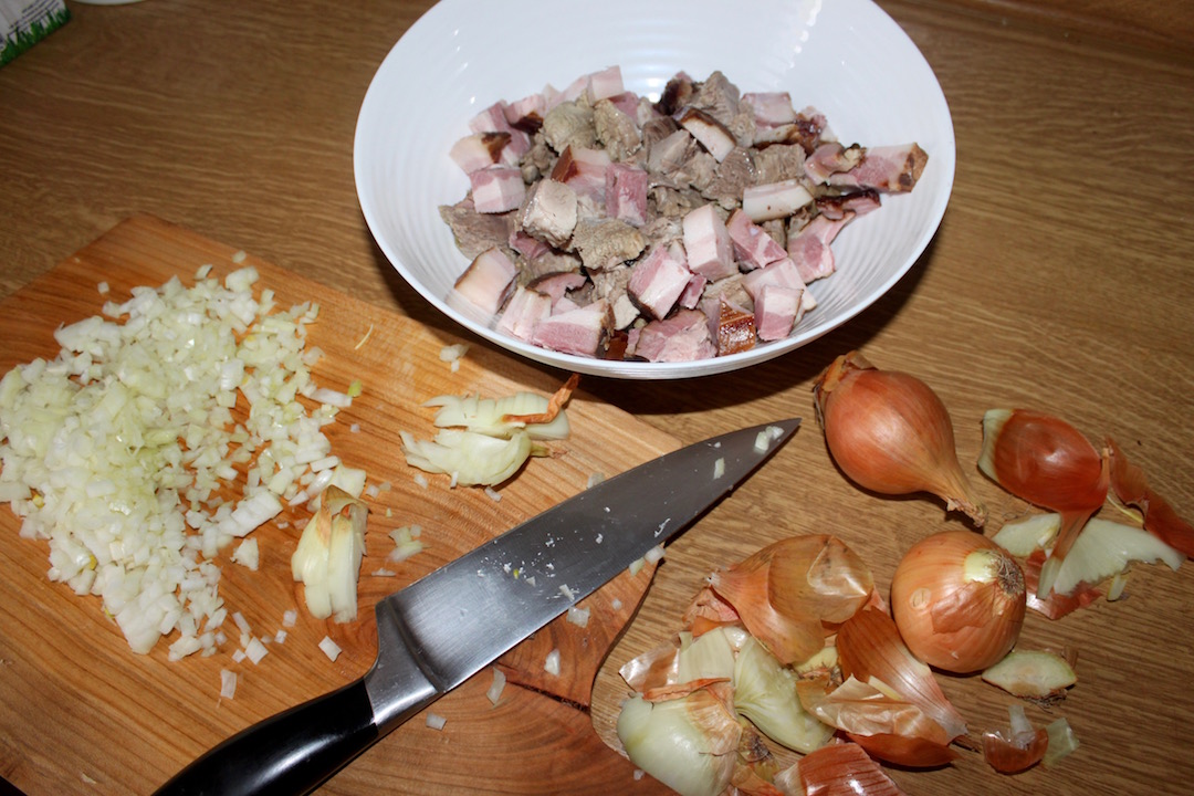 Ugotowany boczek pokrój w sporą kostkę, a następnie odstaw do przestygnięcia.