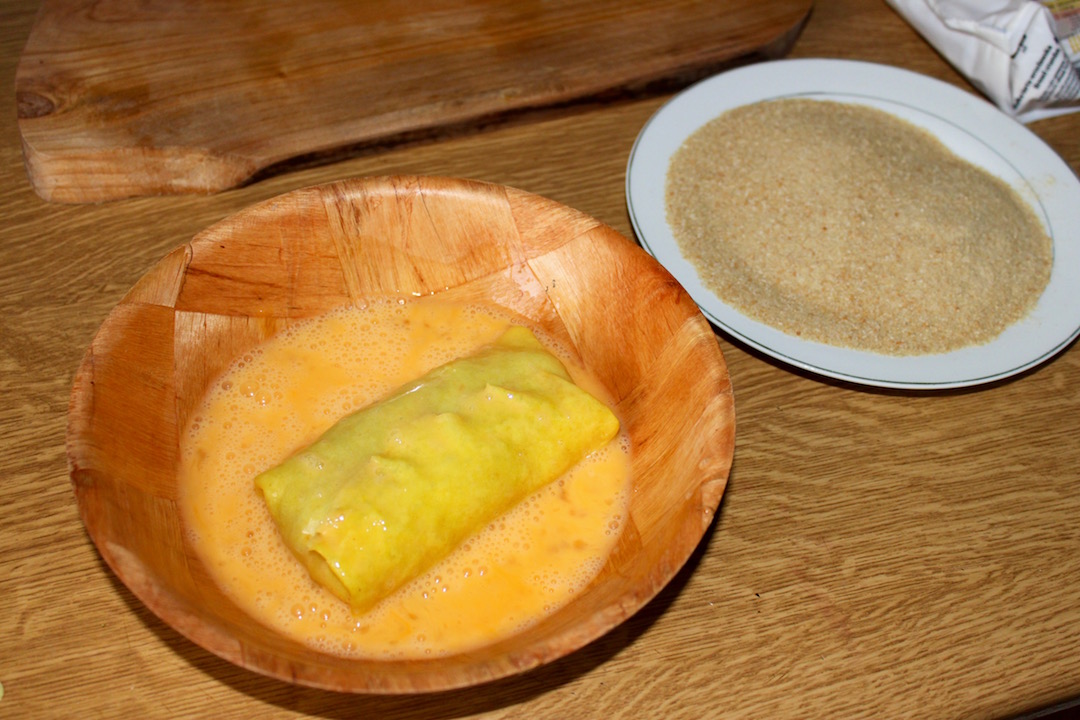 Każdego krokieta obtocz w roztrzepanym jajku i bułce tartej.