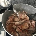 Cebula: Cebule obierz, pokrój w grube kawałki i dodaj do królika. Duś całość przez 5–10 minut, mieszając, aby cebula zmiękła (uważaj, by jej nie przypalić).
