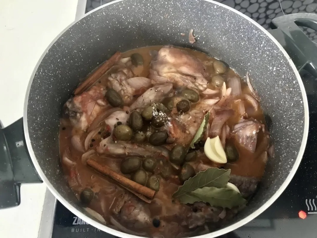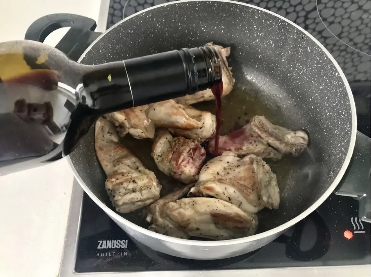 Smażenie: W garnku rozgrzej pół szklanki oliwy. Włóż kawałki królika i smaż na mocnym ogniu przez około 10 minut, aż mięso ładnie się zrumieni z każdej strony.