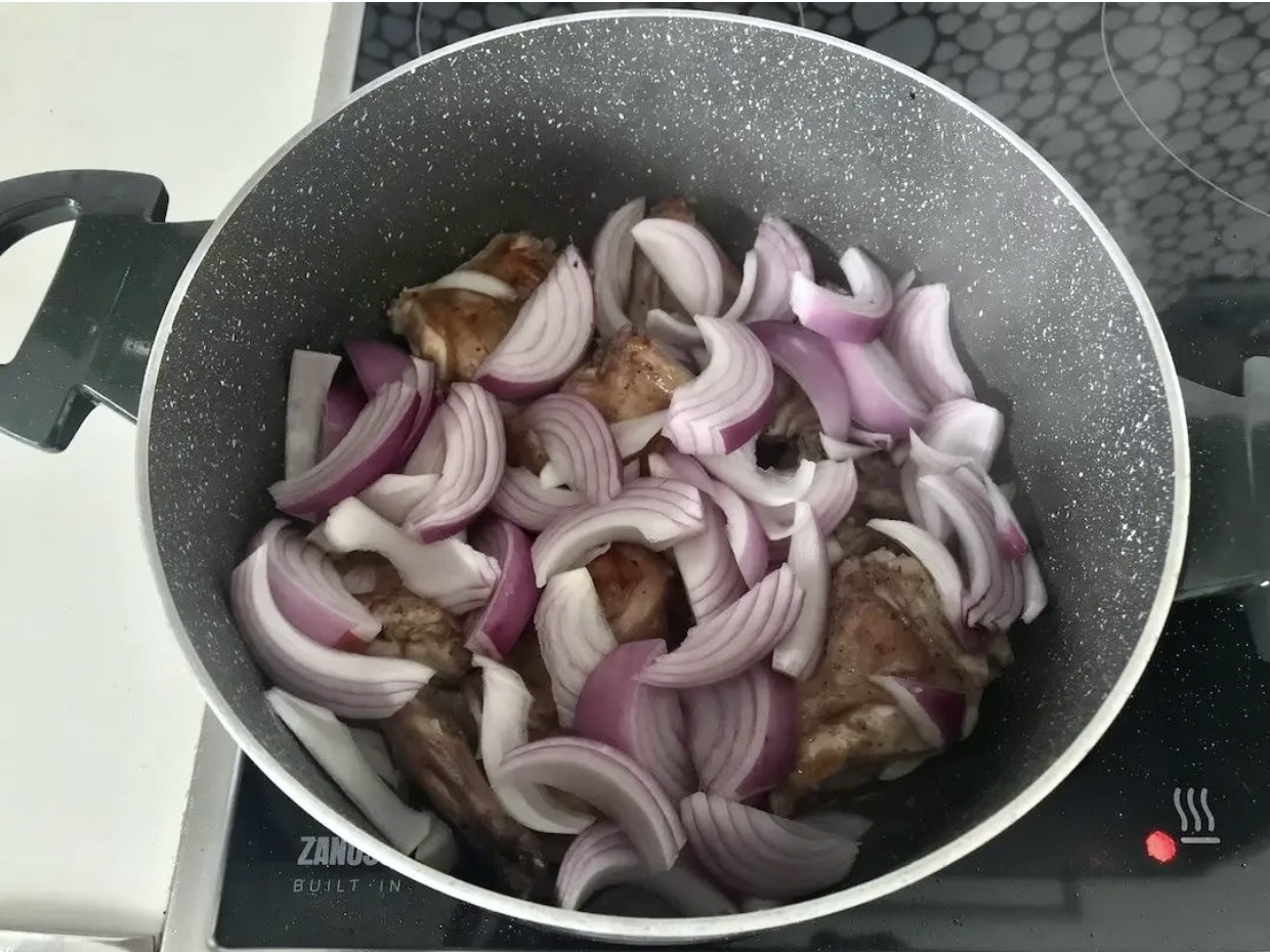 Cebula: Cebule obierz, pokrój w grube kawałki i dodaj do królika. Duś całość przez 5–10 minut, mieszając, aby cebula zmiękła (uważaj, by jej nie przypalić).