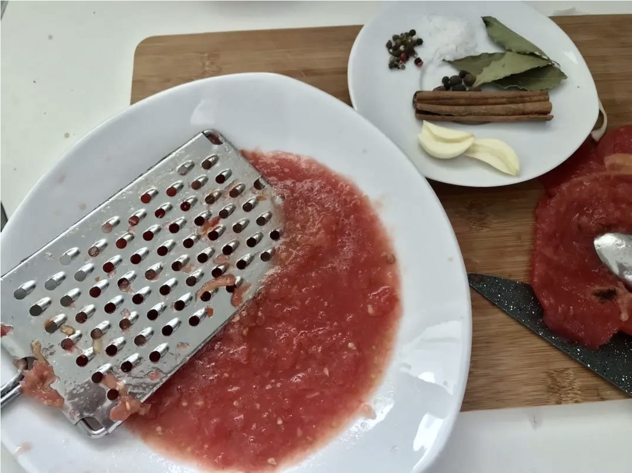 Sos: Pomidora zetrzyj na tarce i dodaj do garnka. Wlej szklankę gorącej wody.
