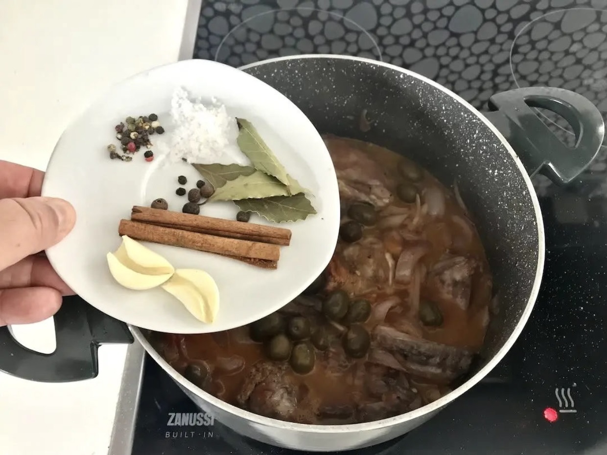 Przyprawy: Do garnka wrzuć oliwki, czosnek, ziele angielskie, pieprz ziarnisty, liście laurowe, sól oraz laskę cynamonu.
