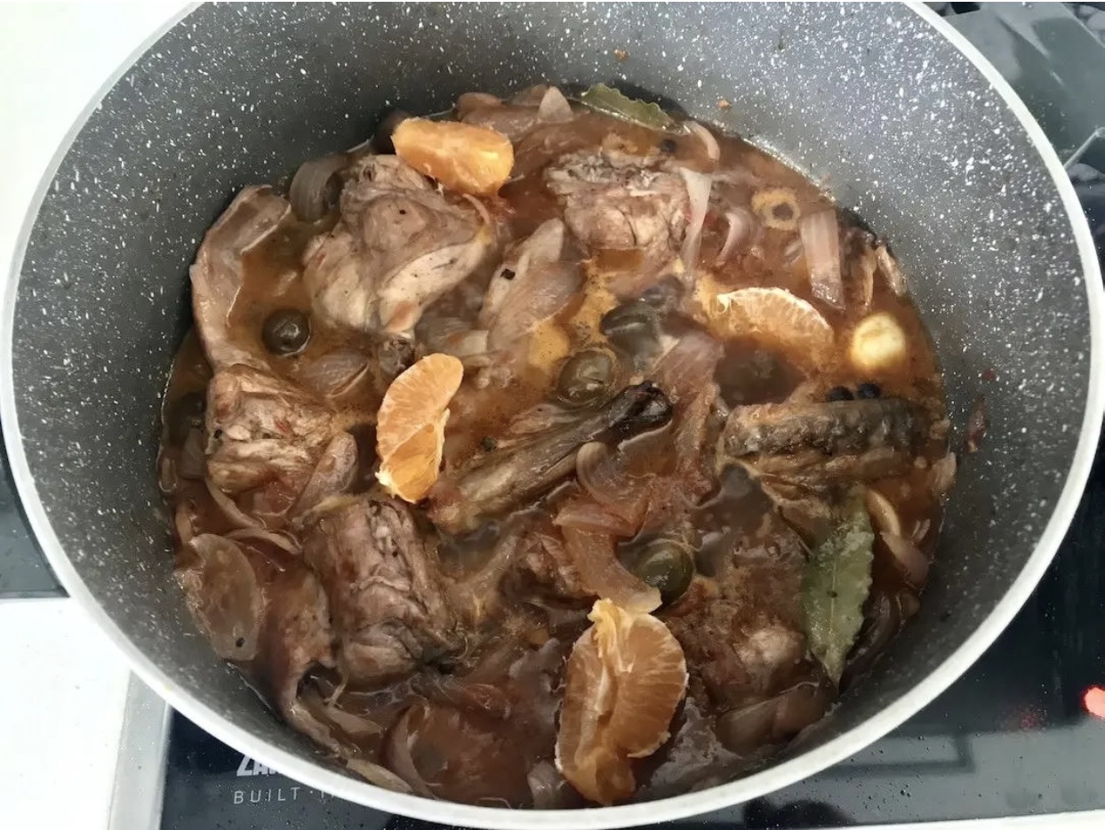 Królik duszony to bardzo wdzięczne danie. Stosunkowo łatwe w przygotowaniu, za to daje wiele możliwości jego przyrządzenia. W poniższym przepisie królik zatopiony jest w pysznym aromatycznym sosie, którego smak i zapach tożsamy jest ze smakami i aromatami Bożego Narodzenia. A konkretnie, pachnie cynamonem i mandarynkami. Jest w nim również sporo cebuli, która długo duszona rozpada się i nadaje całości słodyczy. Danie najlepiej przygotować dzień przed spożyciem, bowiem przez noc sos nabierze magicznego smaku.