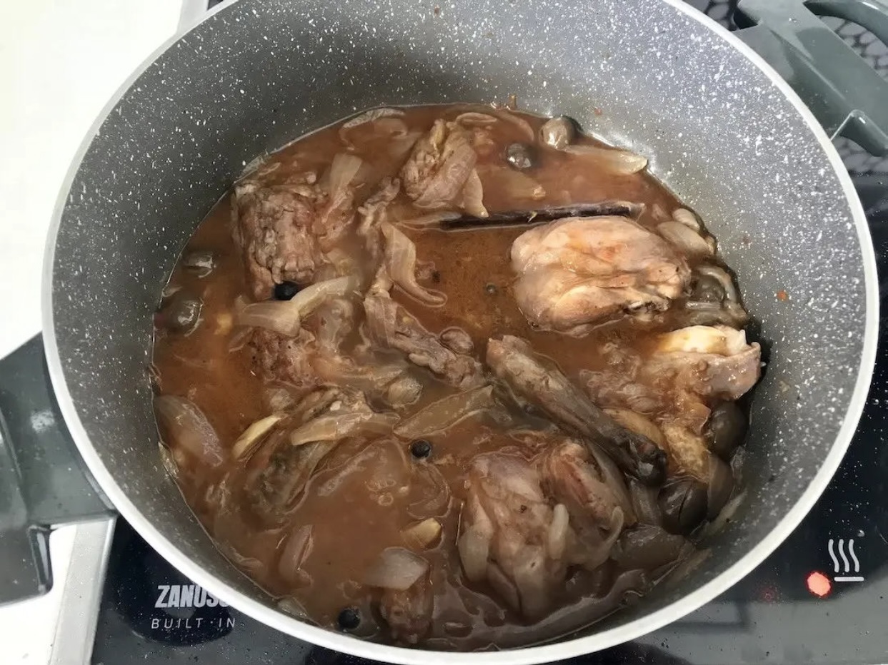 Duszenie: Zmniejsz ogień, przykryj garnek, a następnie duś królika na wolnym ogniu przez około 60 minut.