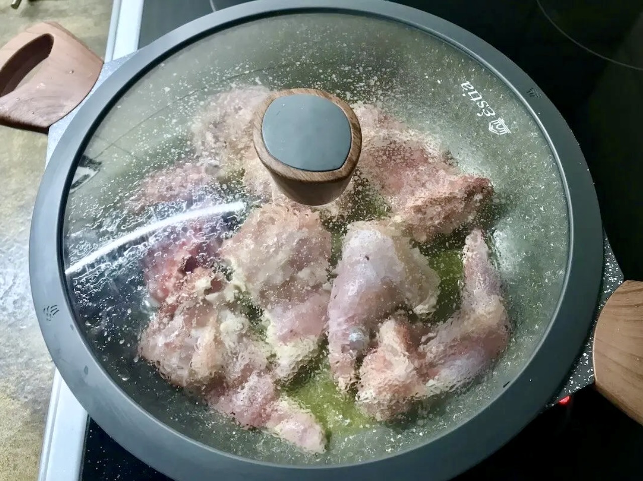 Duszenie: Skręć ogień pod patelnią do minimum, przykryj patelnię pokrywką i duś królika: