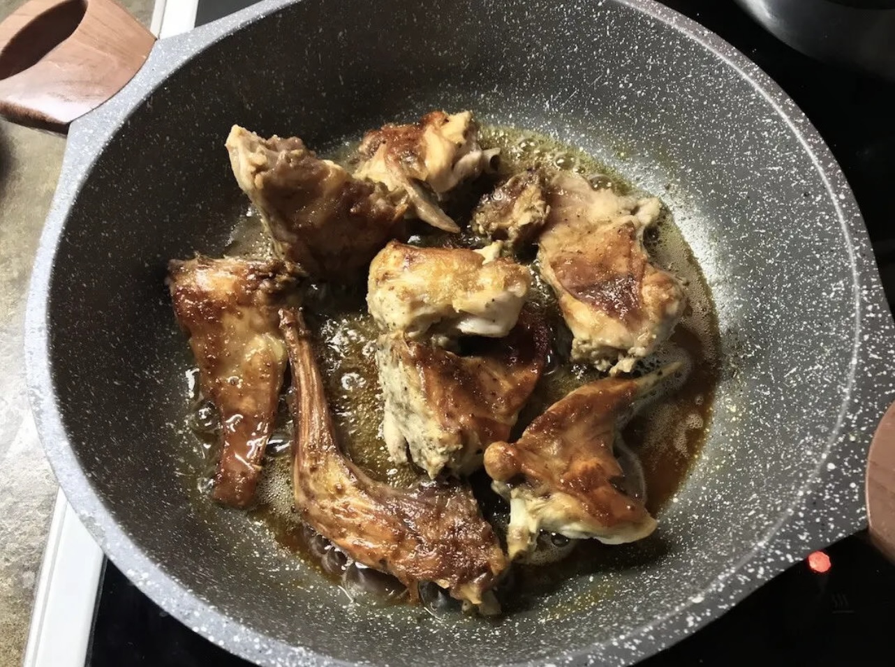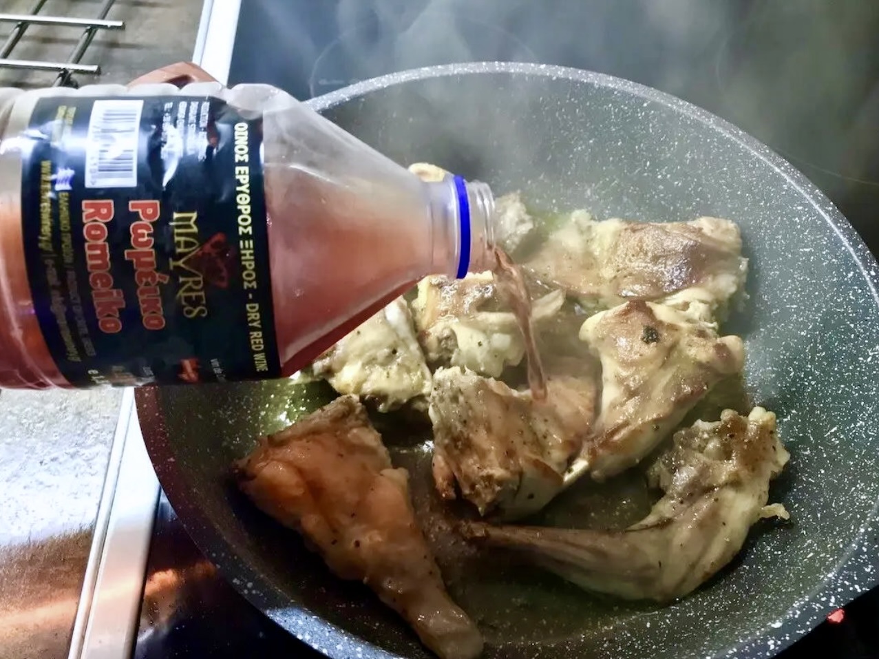 Smażenie (Tsigariasto): Na głębokiej patelni rozgrzej oliwę do średniej temperatury. Wrzuć królika. Przykryj patelnię pokrywką i smaż mięso na mocnym ogniu przez około 5 minut, aż bardzo dobrze się zrumieni.