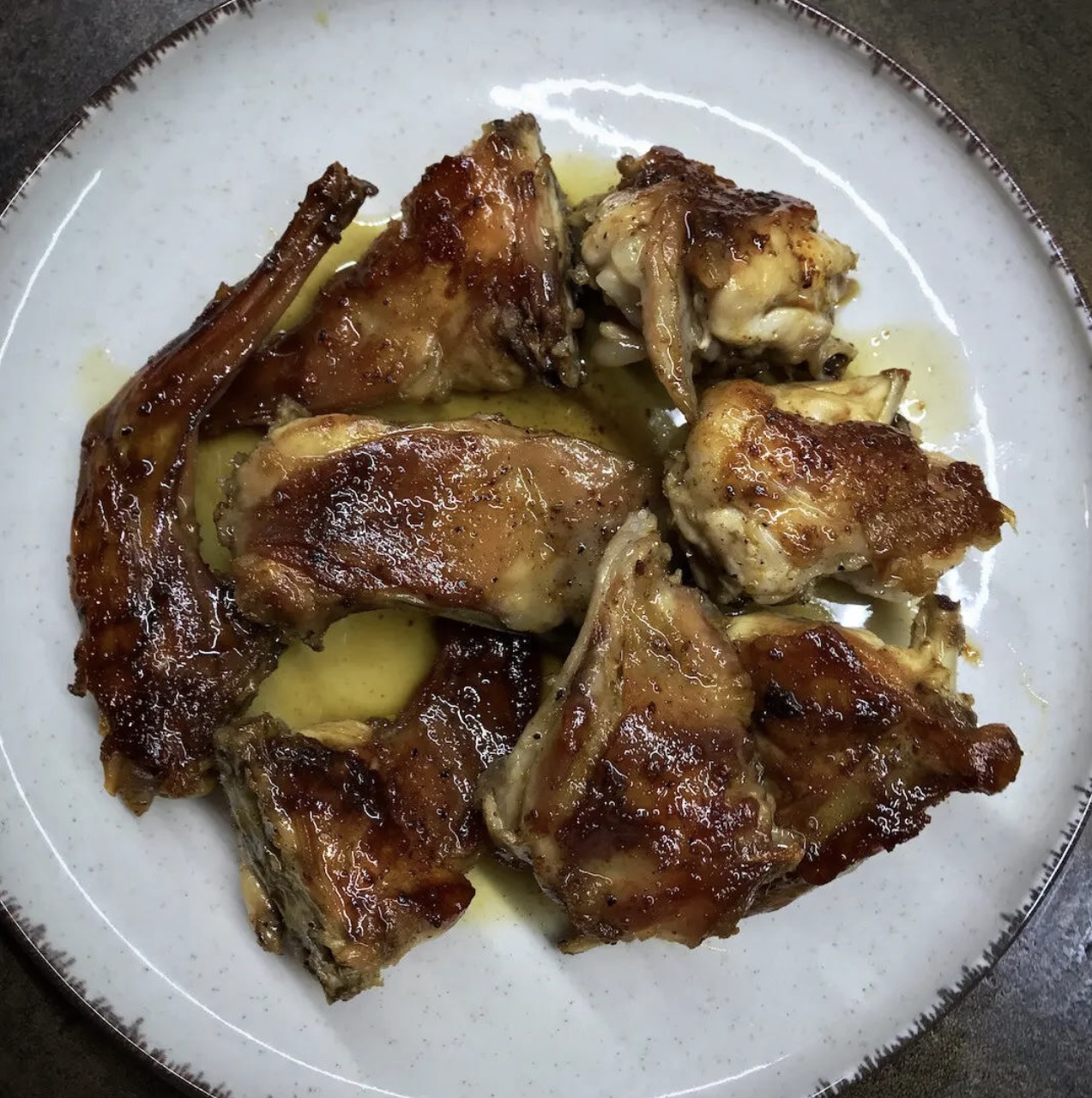 Królik w oliwie duszony podawaj chwilę po przygotowaniu, polany aromatyczną oliwą, która powstała podczas duszenia.