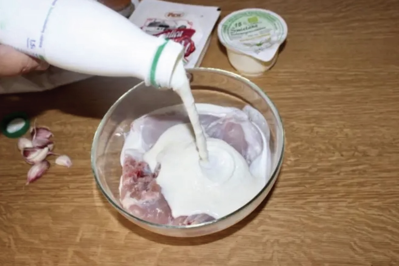 Zalej mięso kefirem, tak aby było nim przykryte.