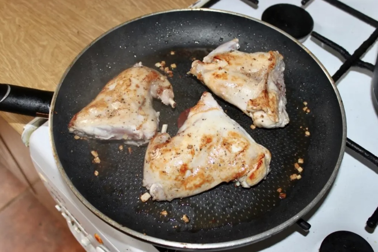 Dodaj królika i obsmażaj go krótko z obu stron na mocnym ogniu, aż ładnie się zarumieni.