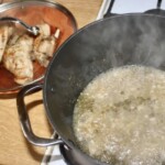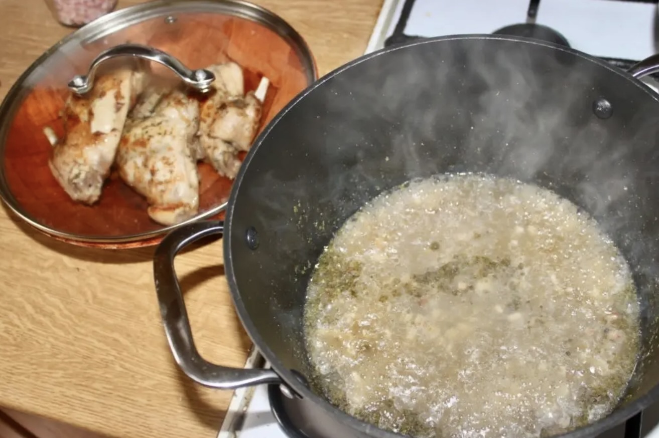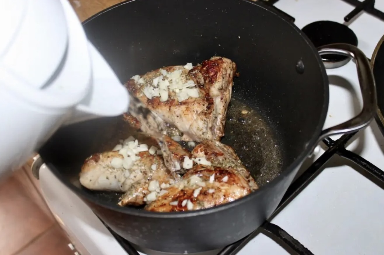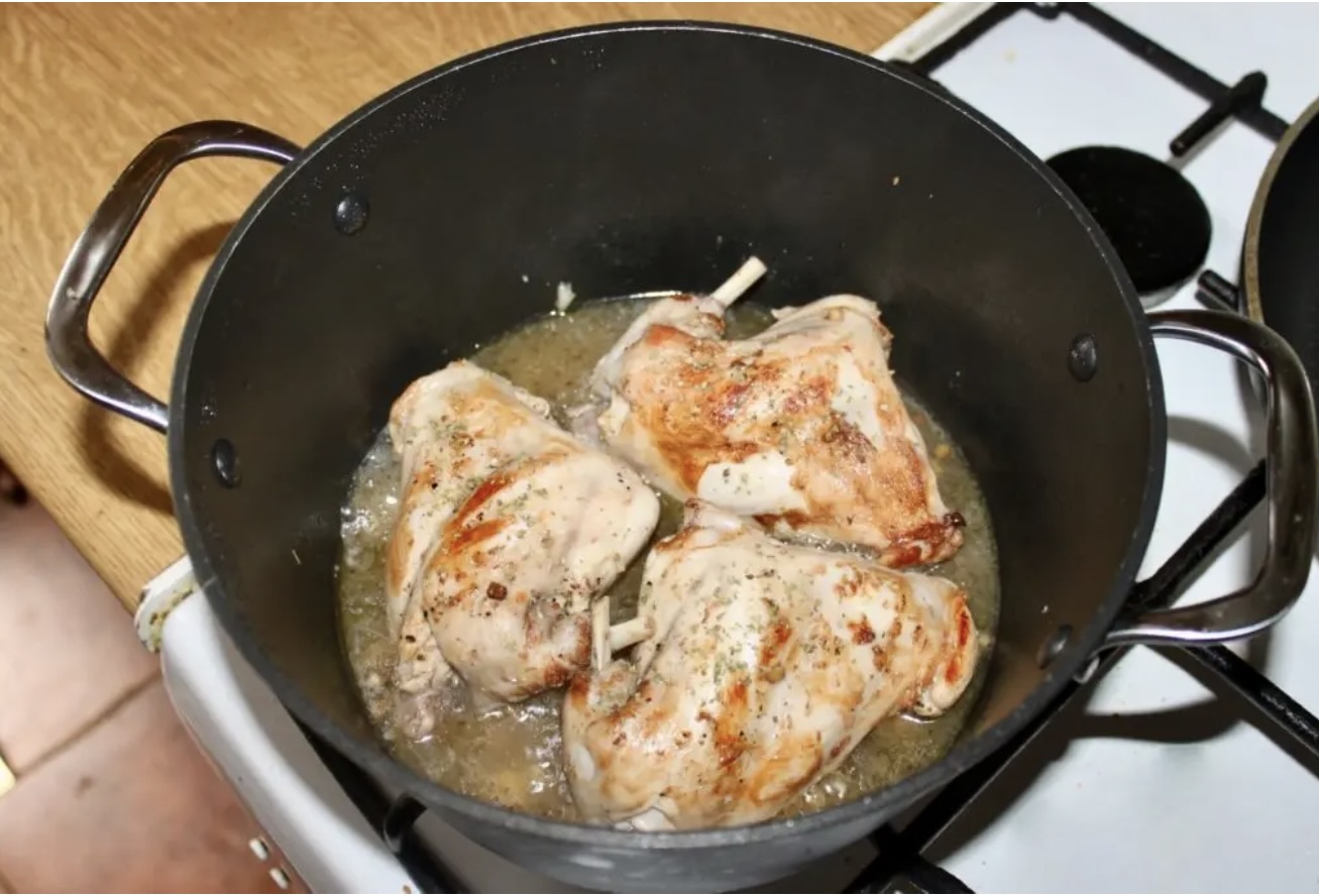Przesmażonego królika wraz z niewielką ilością tłuszczu z patelni przełóż do garnka.