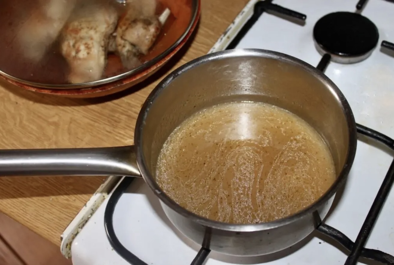 Jeżeli sos jest za rzadki, zagęść go, wlewając rozpuszczoną połowę łyżeczki skrobi ziemniaczanej w odrobinie zimnej wody.