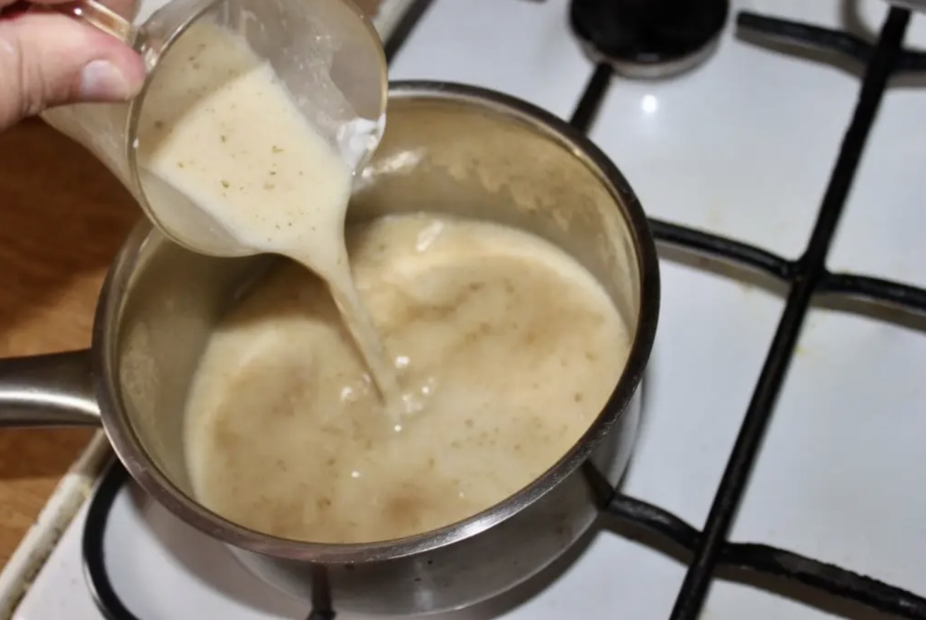 Zahartuj dwie łyżki śmietany sosem i wlej do garnka. Zamieszaj i zagotuj.