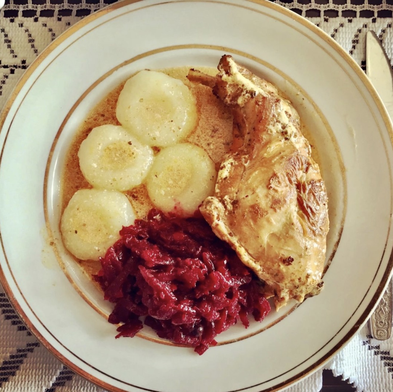 Królik w sosie śmietanowym smakować będzie „najlepiej w stylu śląskim”, czyli z kluskami śląskimi (jak zrobić szare kluski śląskie) i buraczkami zasmażanymi (buraki zasmażane).